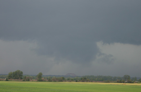 Here is a picture taken a couple minutes after the one above - notice the intense wet rear flank downdraft (RFD) cutting in behind the bridge and to the left of the wall cloud. This is very typical of HP supercells, and is usually an area of very heavy rain, strong wind, and sometimes (though not for the most part with this storm) large hail. At this time, the wall cloud was probably about over the Mississippi River between the south part of St. Louis city and Cahokia, IL, or may have already crossed.