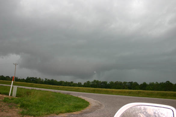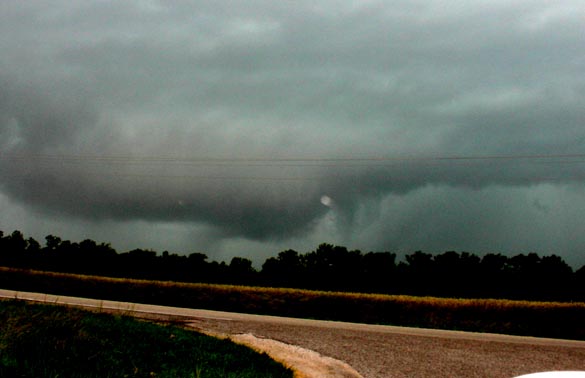 This picture was taken looking northwest from a couple miles east of Waterloo. Note what may be a funnel just to the right of the wall cloud - I couldn't tell, but in the enhanced version of this photo, it looks like it may have been: