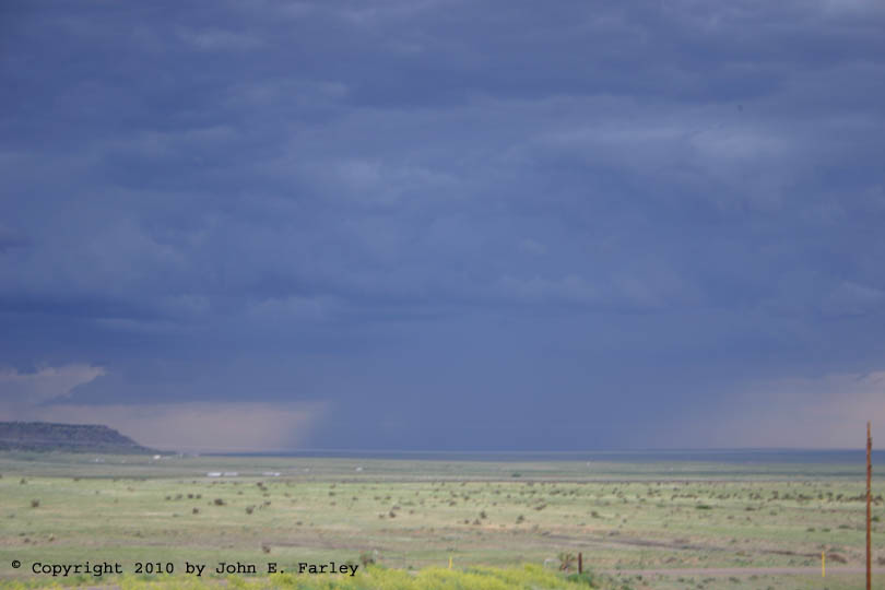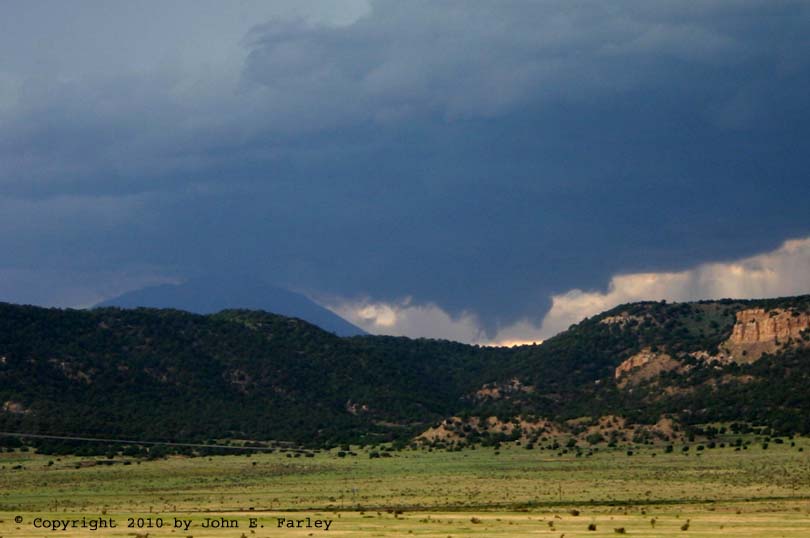 By now, though, the storms were weakening, so I knew it was time to head back to Santa Fe. I got a nice sunset view with some cumulus and a weak storm along the way. At this time, it appeared that all of the storms were weakening or dying out, though a few were still left in the southern Sangre de Cristo Mountains in the area between Santa Fe, Taos, and Las Vegas. With the storms weakening, I expected an uneventful drive back to Santa Fe.