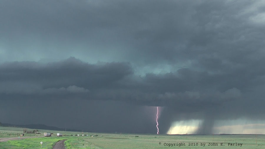 I think these were more likely scud fingers than funnels under the lowered area, but can't really say with any certainty. This was quite some distance away from me; perhaps 10 miles, so it was hard to tell. A minute or two after getting this picture, I managed to get about 30 seconds of video of this feature, but it had already become less organized. The video shows upward motion, but it is hard to tell about rotation, given the distance. I do think it is safe to say there was a wall cloud here, though. After getting these pictures, I continued north toward the storm past the Aguilar exit. However, the space between the splitting storms was now filling in, and this area was starting to surge toward the southeast, so I soon had to backtrack back to the Aguilar exit. There, I got this picture of the surging storm and these video captures of one of the many flashes of CG lightning, as well as the step leaders that preceded it.