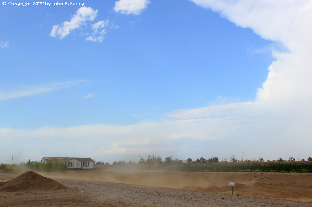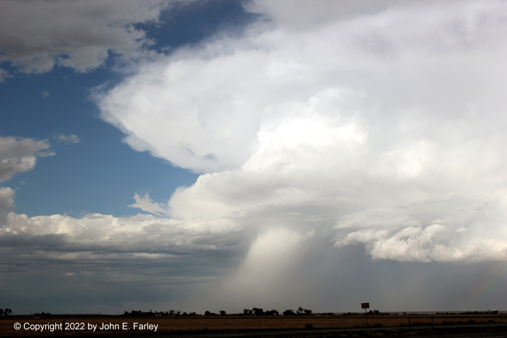 2:00 - Heading NE toward La Junta from Walsenburg on CO route 10, I am monitoring the Colorado Springs storm and note another small one starting to go up just to my north. I know that as this storm matures it could also go severe, but I figured that 1) the Colorado Springs storm looked much more impressive and 2) the new storm, if it turned at all SE, would move into an area south of La Junta with almost no east-west roads to keep up with it. Hence, I headed north toward Fowler on CO route 167, passing east of the new storm. Once I was past it, I stopped briefly and noted that it had quite a bit of thunder for something that at the time looked like a very minor storm. Here is a picture I took as I was about to turn north and cross ahead of this new, small storm: