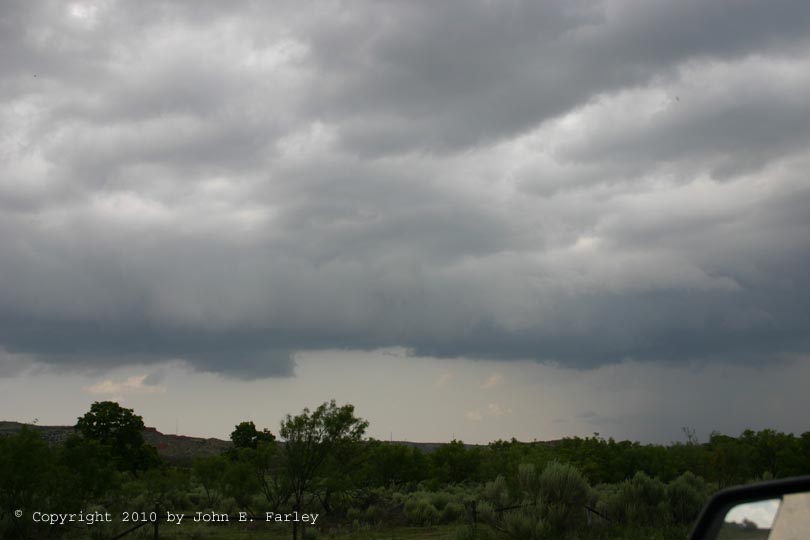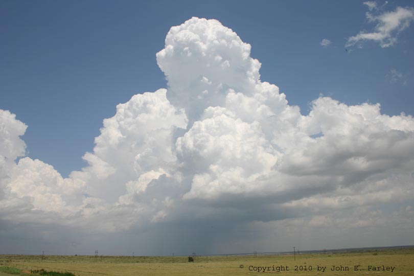This picture was taken from just south of Borger looking NNE. I decided to go through Borger and on the NE of there on the back roads, getting as close to the storms as I could while staying on the south side of the Canadian River. I did not wish to go on north through Stinnet and chase the storms all the way to the northeast corner of the Panhandle, for the reason noted, and had I tried, I would have probably been either behind the storms or in the core for quite some distance. So I decided to just see what I could see from there. As I watched, the storms along the front, just to my west, really started getting their act together. Since I was almost underneath them, I could look almost straight up at the blossoming tail-end updraft: