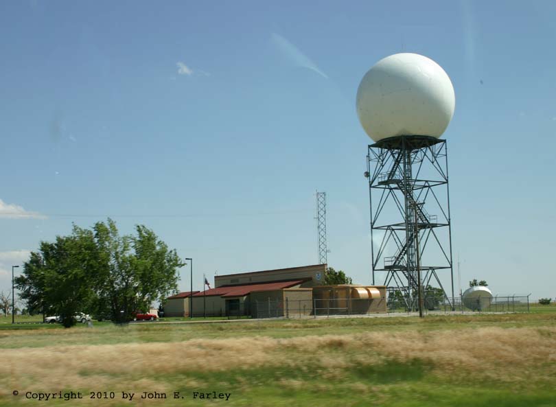 Up to this point, with these storms at the tail end, the storms along the front farther to my northeast looked quite linear and somewhat HP-ish - actually more so in both regards than the previous day's storms in this area. I knew that the potential existed for the storms to get their act together eventually farther to the northeast - but if it happened, it would not happen quickly. So, I broke off around 4 p.m. and headed back toward Amarillo to get on I-40 and head back to Santa Fe. When the merger was complete, the storm did look quite good visually and on radar, and within an hour or so after I left it, did get a SVR warning. Eventually it did produce a brief tornado up in the northeast corner of the Panhandle, but as I understand it this tornado was both short-lived an rain-wrapped, similar to ones that occurred on other storms farther up the line in OK. Given that it would have taken several hours more of chasing to see these and my desire to get back to Santa Fe at a reasonable hour, I do not regret letting these storms go. Driving back toward Amarillo, I passed the AMA NWs office and NEXRAD for the fifth time this trip, and this time I decided to snap a few pics - here is the best one: