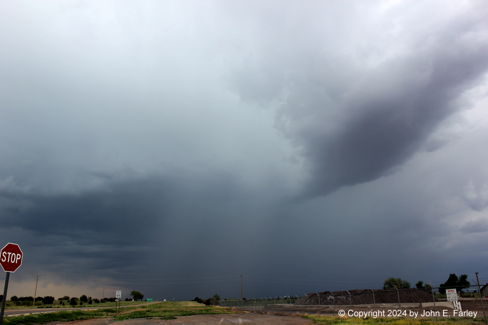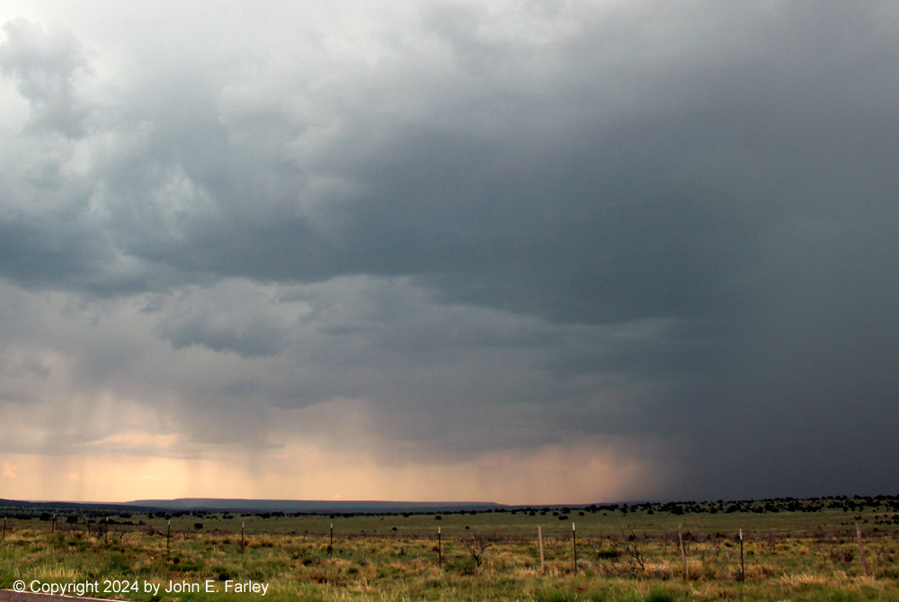 By 3:30 it was clear that I was not going to get ahead of the storm, the heaviest core of which passed just to my east, without driving in the storm for some distance and maybe not even then. So I decided to head back to Santa Fe and see what the predicted evening storms might bring. Around that time, a new SVR warning was issued, again for a very large area, that included the storm I had been chasing. Between this warning and another large warning farther north, pretty much all of New Mexico north of I-40 and east of my location was covered by these two warnings. Other large warnings extended into Colorado and eventuallly the TX and OK Panhandles and western Kansas. These warnings collectively covered about as big an area as the severe thunderstorm watch that was issued for estern CO, far norteast NM, and parts of the Panhandles.