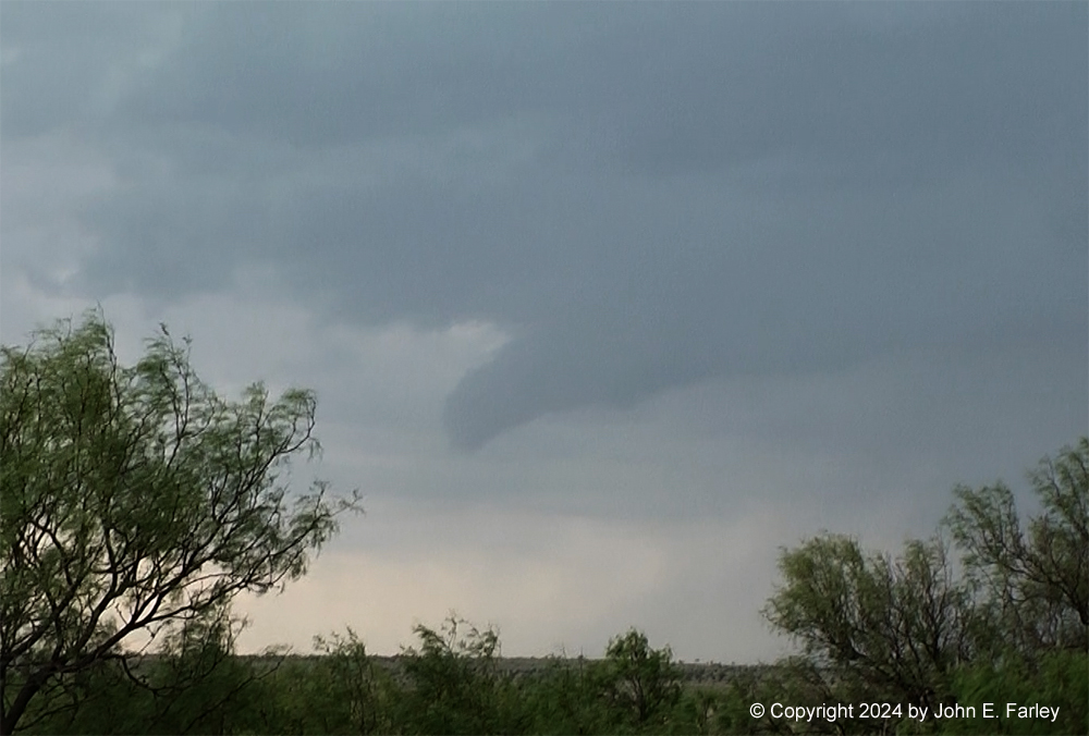 By this time the storm was not yet SVR-warned, but two special weather statements had been issued on it for wind up to 55 mph and nickle-sized hail - about as close as a storm can get to the threshhold for "severe" without crossing it. There was a large SVR warning for a scattered cluster of storms farther east, covering a big chunk of northeast New Mexico. But I had no chance of catching up to those storms. Instead, I followed the storm I was on for 10 or 15 miles northeast from Trementina, as the new cell that had gone up northeast of the previous dominant storm became the strongest storm in the cluster, which was somewhat linear extending from northeast of Trementina back to the south. I mostly avoided the core, and was hit by only a couple small hailstones. The storm did briefly form a mildly interesting lowering, which began with the sudden formation of a large scud cloud under the updraft base, whih was quickly absorbed into the base. I thought a wall cloud might be forming, but it quickly became evident that the feature was more outflow-related, particularly given that it was on the leading edge of the storm: