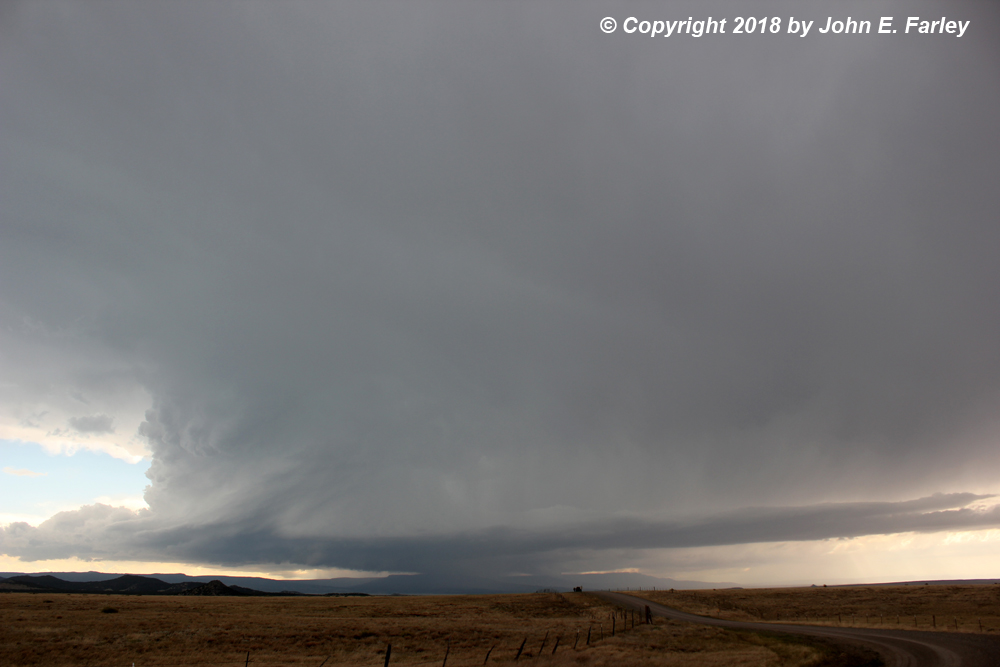 5:00-5:20 - After investigating hail on the ground just north of Branson, and finding stones up to slightly smaller than dimes, I head west on the gravel road toward Trinchera, CO to intercept the rapidly strengthening storm S or SE of Trinidad. By arond 5:00 p.m., this storm definitely has the look of a supercell, again with a long beavertail:
