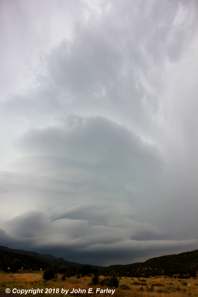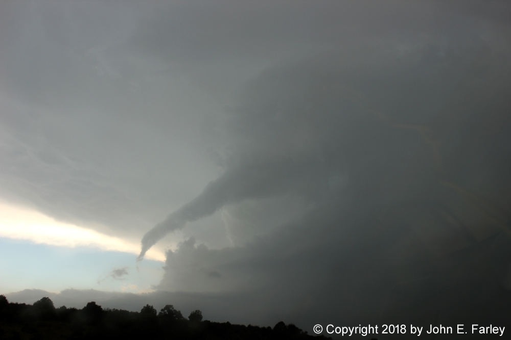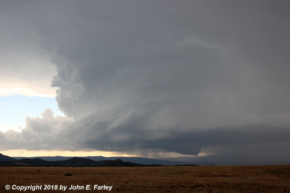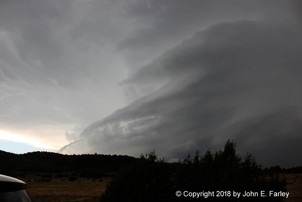 6:15-6:20 - The new storm, again just north of the Capulin Volcano, forms a small lowering and what appears to be an RFD cut. But it does not look as strong as the storm just to its east, and the two storms seem to be merging. The feature becomes less evident, and clouds form around the Volcano, creating almost the appearance of an eruption at times. But of course it wasn't, and the storms seemed to be going into a messier mode. By around 6:30, I decide to head to Raton to get a room for the night.