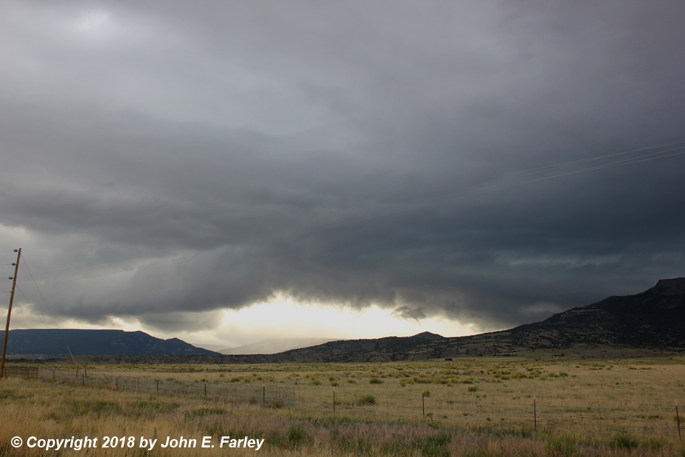 7:25-7:30 - Closer to Raton, still looking at the same part of the line of storms, it becomes evident that the feature under the updraft base was a shelf cloud. I am much closer now, as a distinct shelf cloud forms near the southwest end of the main line. Pretty bright under/behind the shelf cloud, but it is evident from its obscuration of the mountains farther north that precipitation, probably including at least some small hail, is falling back in there. Here is a picture of the shelf cloud:
