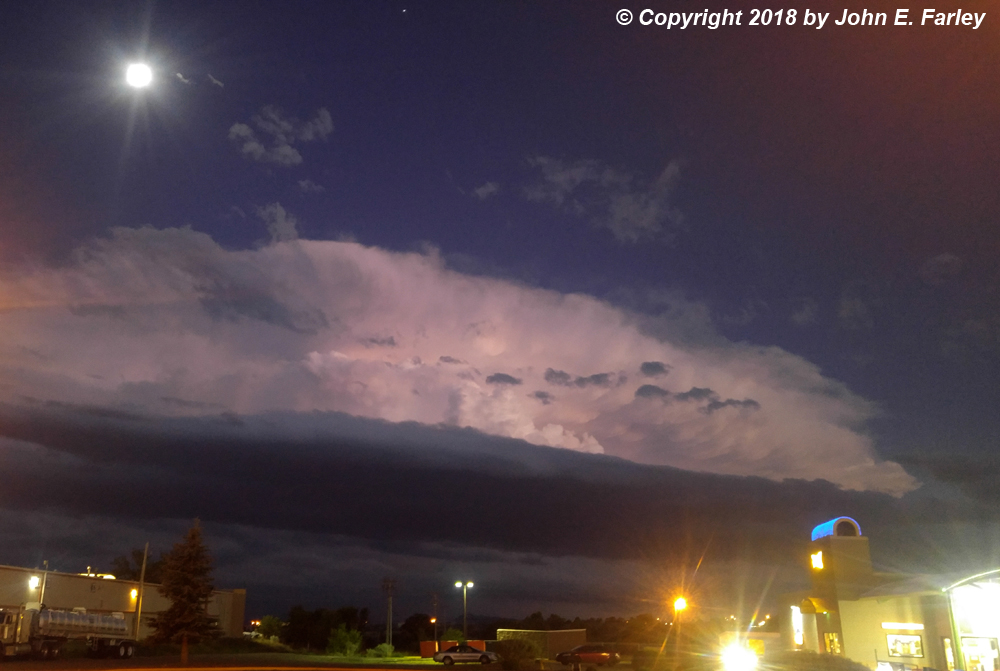 9:00 p.m. - After dinner in Raton, I photograph a storm to my south and a nearly-full moon. This storm is a new isolated cell that has formed basically south or SSW of the tail end of the line, probably supercellular for at least a while, and both it and the line to its NNE get new SVR warnings. Here is a picture of this storm and the full moon, along with the lights of some Raton businesses: