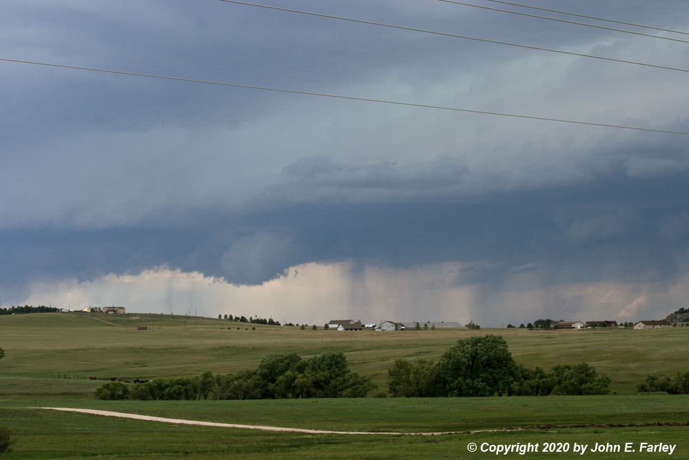 5:30 - I was now at the intersection with Squirrel Ridge Road, between Ellicott and Fountain. The TOR warning was allowed to expire, but the SVR warning continued and was replaced with a new warning a few minutes later. The meso, now without any distinct lowering, crossed the road I had been on a few miles north of me. The storm was moving more SE now, rather than its earlier SSE movement, so less of a right-mover than it had been. It did not look to me like there was much further chance for a tornado, and I still had some thought of trying to get home and avoid a motel stay (did not work out that way, though), so I broke off and headed back west. The last two hail reports from the storm came just east of Ellicott and a bit farther southeast just south of Truckton after I left the storm. No further severe weather was reported from this cell after 6:20, so my decision to leave it worked out OK.