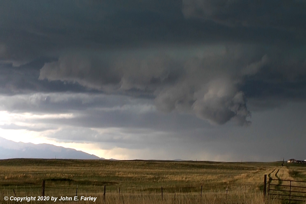 4:45 - The TOR warning was allowed to expire and was replaced by a new SVR warning. The storm was getting close and a few drops of rain started to fall. I decided to move south on the N-S road from Peyton to stay ahead of the storm. About 20 minutes later 1-inch hail fell in the approximate location where I had been, and shortly later, golfball hail a little SE of there. But I stayed ahead of the storm and encountered no hail. Around 5:00, a second TOR was issued, and I stopped again to watch the storm. This was just before the two aforementioned hail reports. I was in very strong inflow now ahead of the storm, with the southeasterly inflow coming from behind me as I looked at the storm. That also showed up well on the radar velocity mode. Around the time the warning was issued, the storm seemed to be cycling. There was a lowering - could have been a funnel, but it was pretty ragged and brief - about halfway to the ground farther off to the northwest: