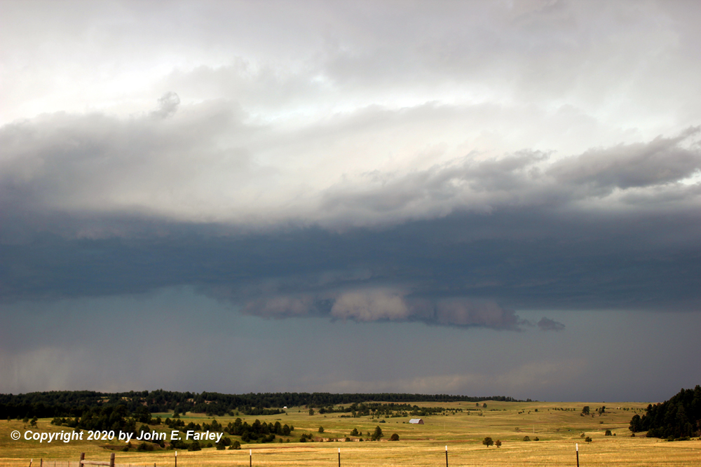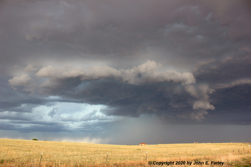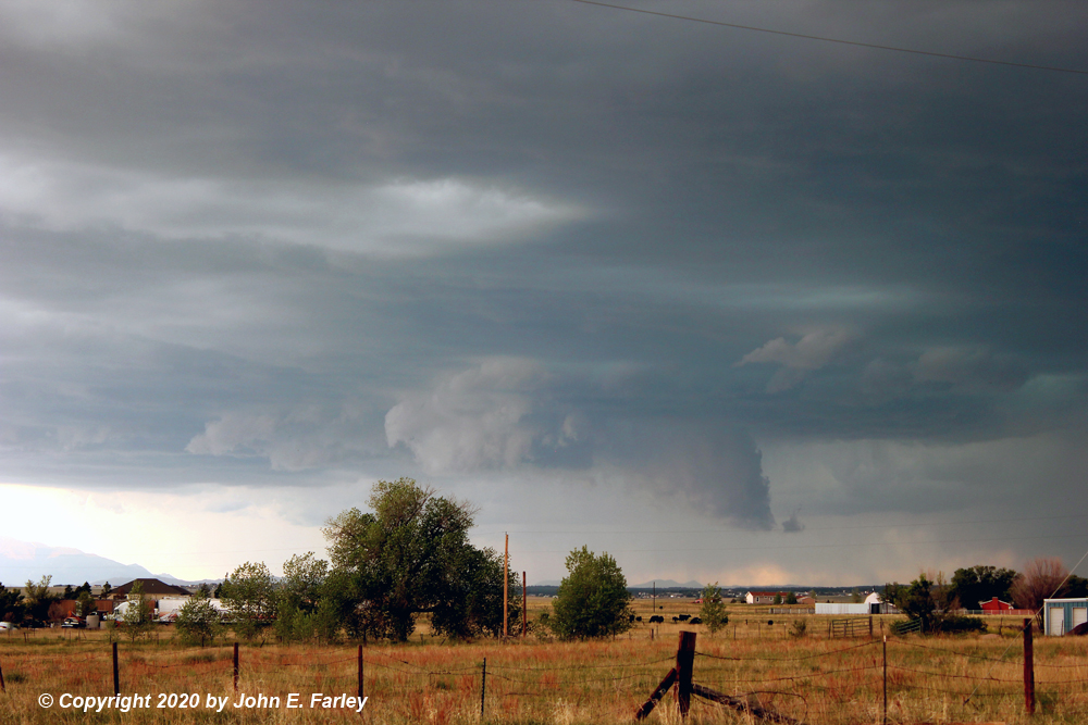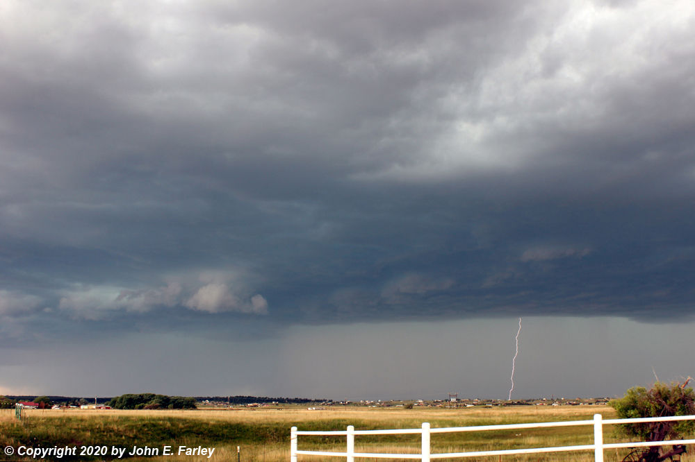 3:00 - By around this time, I was on the storm NW of Peyton, near the El Paso/Elbert County line. The storm, to my NW, had by now had three SVR warnings from the BOU NWS for areas such as Castle Rock, and including Elbert County. The storm seemed to be building to the SW as it tracked SSE from the Castle Rock area, briefly forming a wall cloud a bit down the line SW of the main core. After a little while, the area around that wall cloud filled in with rain and hail and the wall cloud disappeared. A SVR warning was issued for NW El Paso County at 3:20 until 4:00 p.m. by the NWS in Pueblo. I was along and eventually a mile or two west of Elbert Road, northwest of Peyton and south of Elbert. Gradually, I could see to my NW what I at first thought was a shelf cloud but as it got closer I determined that it was actually the meso, as the storm had taken on something of an HP character - there was heavy precip behind the lowered area and both to its left and right. Here are a couple pictures, shortly after this feature came into view and a little later with lightning as the feature surged to the SSE: