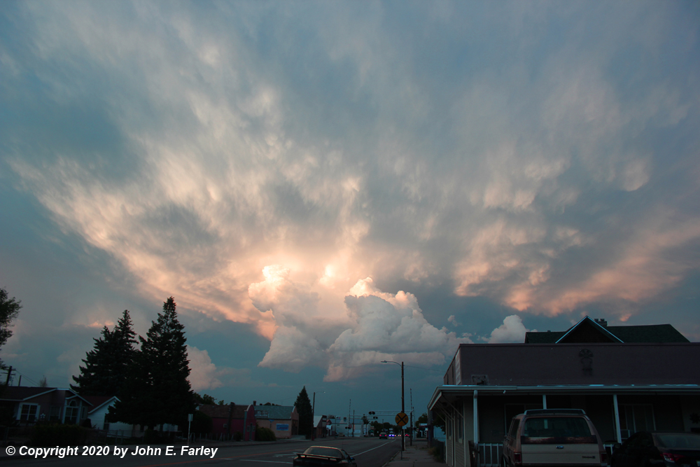 8:15 - I got a nice picture of the setting sun illuminating the anvil and updrafts of a new storm looking east from Walsenburg:
