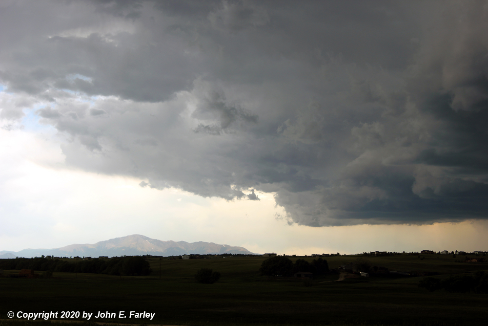 One nice thing about this storm was opportunities, from various angles over the course of the chase, to get pictures of it together with ones of Pike's Peak. Here is a photo of the ominous cloud base as it began to move between Pike's Peak and my location northwest of Peyton.