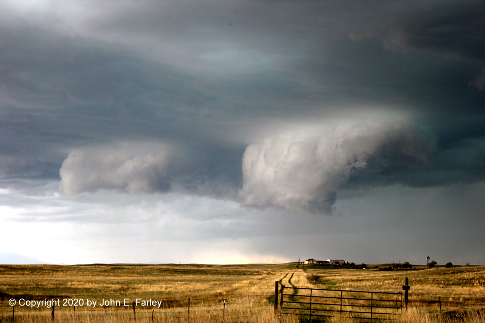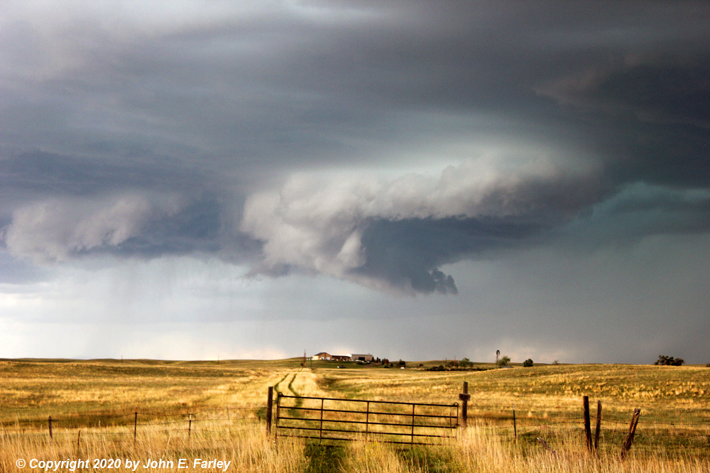 I was on the road out of Pagosa Springs before 9:00, and into Walsenburg to grab some lunch around noon. No storms yet by then, but by the time I was getting into Pueblo for a gas stop around 1:00 p.m., I could see some in the distance. At 1:10 p.m., I think while I was in the Pueblo area, a severe thunderstorm watch was issued basically for the eastern half of Colorado. The watch text mentioned the possiblity of hail to 2" in diameter, wind gusts to 70 mph, and a tornado or two possible. That came about an hour after SPC had issued a mesoscale discussion indicating an 80 percent likelihood of a watch in that area. Before I reached Fountain, where I planned to exit and head east and north to my target, I noticed on radar that what appeared to be a supercell had formed just southwest of Denver. At 2:00 p.m., the first SVR warning of the day was issued by the Denver NWS for parts of Douglas, Arapahoe, and Jefferson Counties, with Castle Rock, among other places, in the path of the storm. Figuring the storm would continue southeast from there, my strategy of heading north toward Peyton seemed just about perfect, though I did delay myself a few minutes by making a wrong turn in Fountain. But I was able to right that and get on track fairly quickly, and as I was heading north toward Peyton, the storm to my northwest gradually came into better view.
