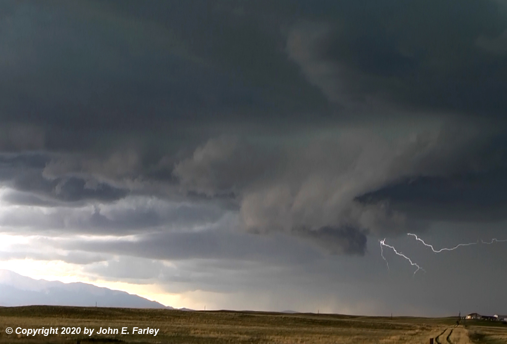 I decided to move down U.S. 24 to the SW a little to get a closer and more clear view and some video. Had to get through a construction zone but after that I found a good viewing spot 3 or 4 miles SW of Peyton and stopped to get video, joined by some other chasers at that spot. There were some possible brief funnels, with the lowering extending halfway or more to the ground from the cloud base at times. Some cloud-base rotation, but no real persistent funnels. Lightning occurring included not only CG in the core but also some CC bolts coming out of the wall cloud or out from behind it. Here are a few pictures and video captures: