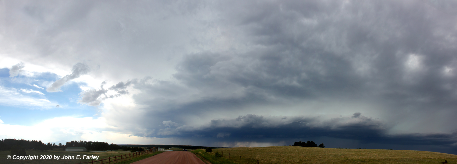 A few final thoughts. One interesting aspect of this storm was the very pronounced beavertail feature that it had for much of its life. During much of the chase I was near or underneath it, so I was not real conscious of it, thinking it may just have been updraft base from its appearance from underneath. But it was very noticeable near the end of the chase when I got a little more ahead of the storm, and in looking at my pictures I could see it was also evident when I first got on the storm, while it was still pretty far away. Here are two panorama photomerge images, the first from very near the beginning of the chase and the second from near the end. The beavertail feature is quite evident on the right-hand side of both pictures: