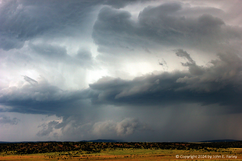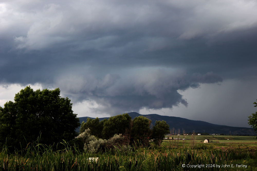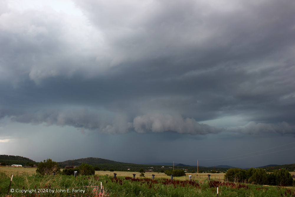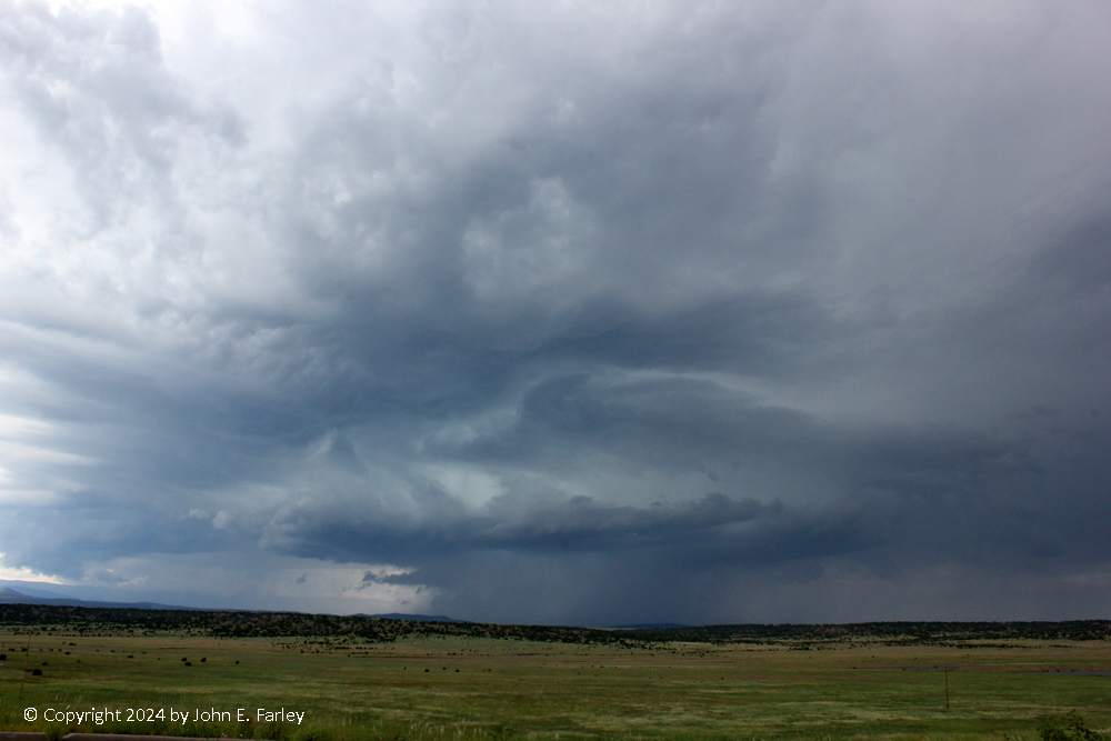 I moved up the road (the frontage road to I-25 north of the northernmost Las Vegas exit) for a more open view, and there I was going back and forth between photographing the wall cloud and trying to use the lightning trigger, and did not do the latter well, messing up nearly every way I could on the lightning. But I did get some nice pictures of the wall cloud: