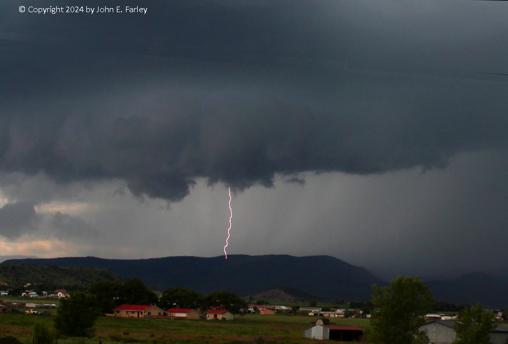The storm had nice structure, though at this time not really a wall cloud, but it seemed to be marginally supercellular as it was a single cell, intense, and a right mover, being driven to the SW or SSW by its updraft on the SW edge of the storm in the presence of weak steering flow to the SE or SSE. I took quite a few pictures, including these two: