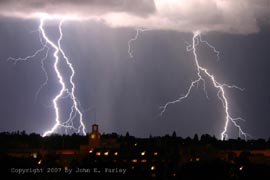 On August 5, 2007, I was fortunate to observe a spectacular lightning display in Santa Fe, NM as a monsoon thunderstorm approached the city from the south. I photographed the bolts above looking south from a hill in the northern part of the city, toward the Bataan Memorial in downtown Santa Fe. More pics are below - Click any thumbnail below to see a full-size image.