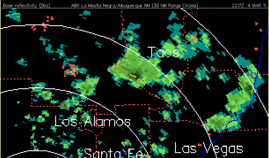 What had been a small snowshower had blossomed into a nasty-looking thundersnow storm with a 40+ DBZ radar return along the county line of Rio Arriba and Taos Counties to the southwest of Taos. Here is a radar image from around the time the photo above was taken: