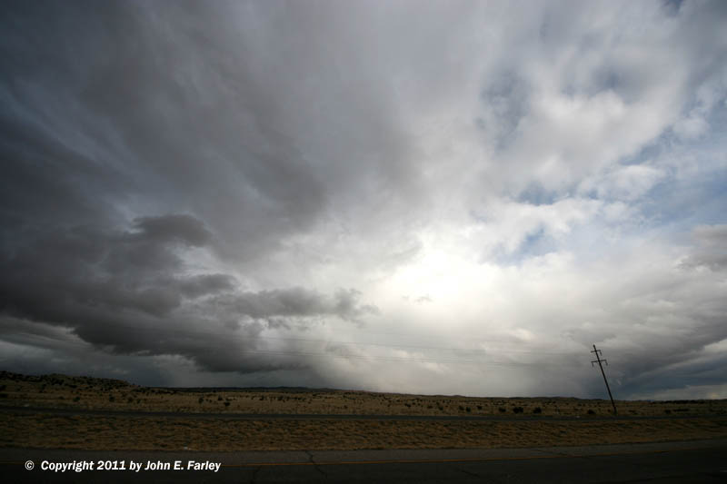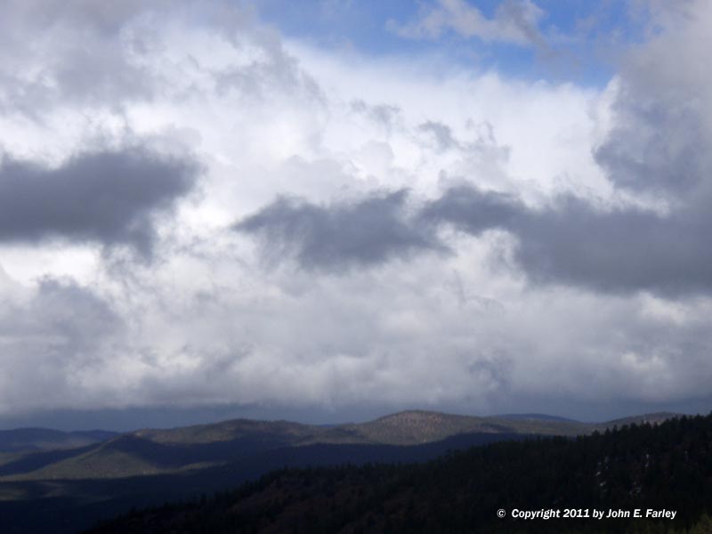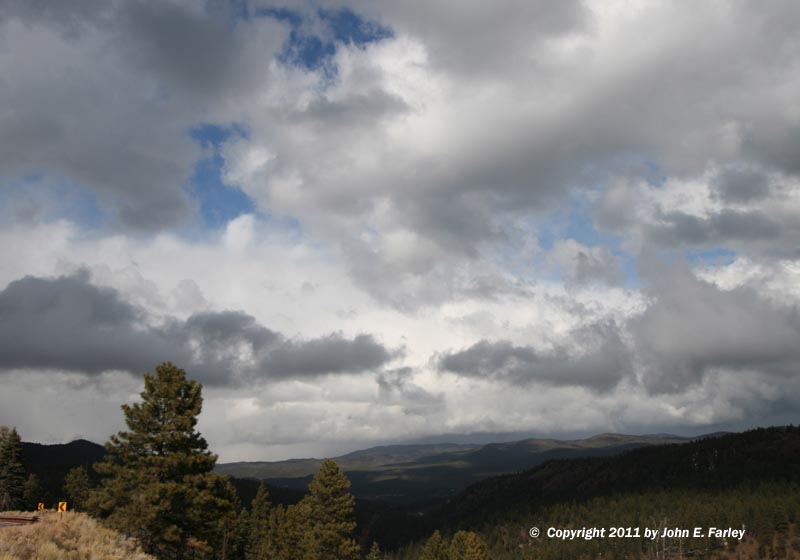 I headed north toward Taos on the High Road to Taos Scenic Byway, and once I crossed over the pass south of Taos, the scenic overlooks along the road that afford a view to the northeast offered me a good view of the storms over the Taos Ski Valley/Wheeler Peak area: