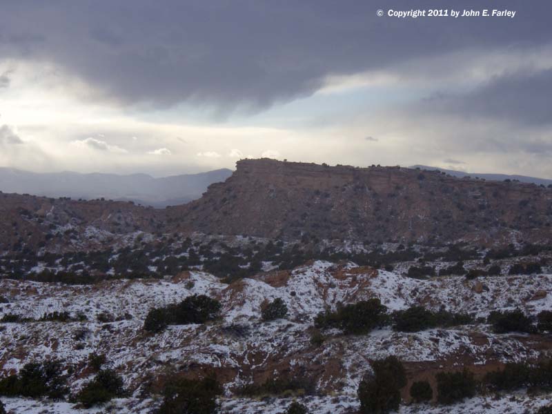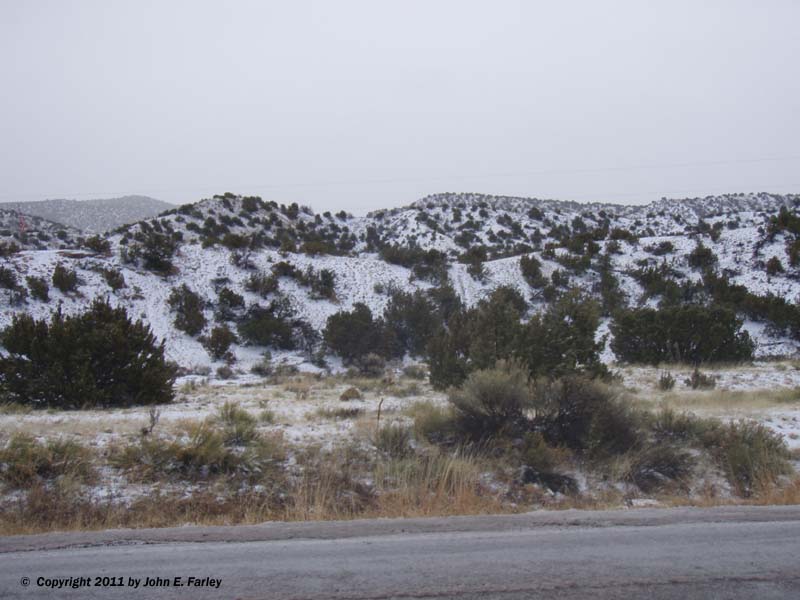 As I was passing through Espanola, I noticed some decent structure to my east so I decided to head up to Chimayo for a better view. However, by the time I was through the wooded, hilly, built-up area just east of Espanola, I was in light precipitation and there was not much to see. Chimayo had about a half inch of snow, and was getting a light mixture of snow and drizzle as I drove through. I did not get any more good pictures of the storm, but the fresh snow in the desert south of Chimayo made for some nice scenery: