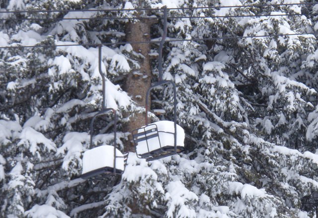 A chairlift that was not in use. Note the snow accumulated above the backs of the seats!