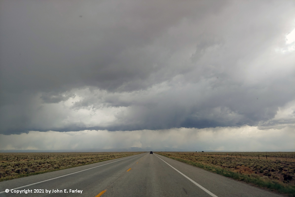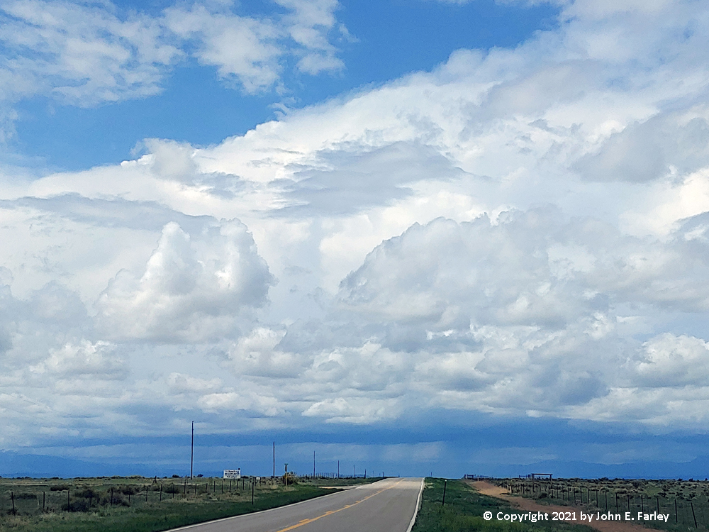 Continuing west toward Alamosa, I could soon see that another line of thunderstorms was going up to my west, likely somewhere just south and west of Alamosa at that time - probably going up on the still very strong outflow from the storms over the mountains to the east and northeast. But these storms looked different from the earlier ones - the precipitation coming out of the cloud base had a wispy look, typical for snow or graupel (snow pellets), rather than the straight shafts you see with rain: