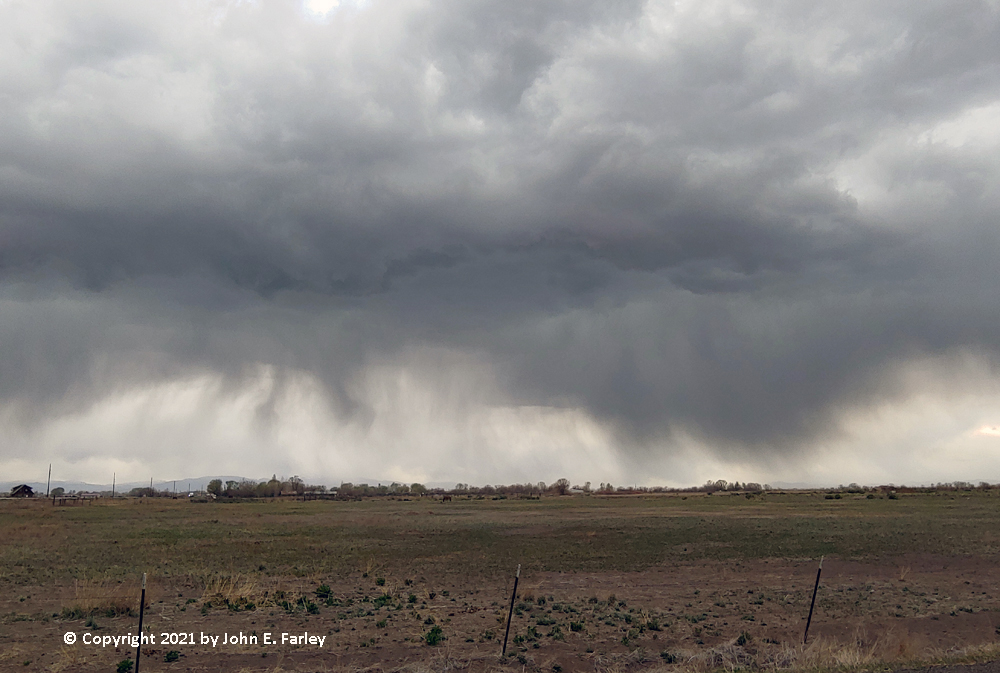 As I crossed over La Veta Pass with the temperature now in the mid-40s behind the storm, light rain was falling, and it mixed with a little wet snow. Once I got over the pass, the temperature remained cold down in to Fort Garland, and intense, cold outflow was blowing to the southwest from the storm. I could see large clouds of dust being lifted to my southwest, but it was too far away to get good pictures of it. Also coming down the west side of the pass I encountered a small thunderstorm with briefly heavy rain, mixed with a little hail or graupel.