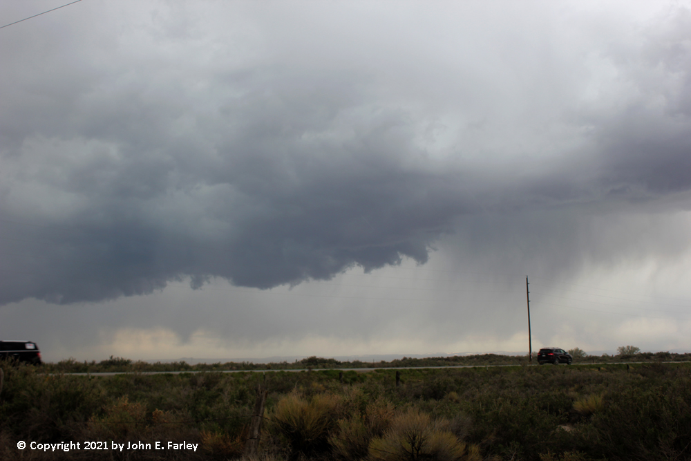 During a brief stop in Monte Vista, the next town around 15 minutes west of Alamosa, I noticed that a special weather statement had been issued for the area just east of Alamosa. Unlike the earlier one for Alamosa, which I had not seen, this one mentioned the possibility of funnel clouds and a brief tornado, similar to the earlier statement for areas to the north of Alamosa. Being that close still, I did not want to miss even a remote chance of a tornado, so I turned back and went back to just east of Alamosa. There was quite a bit of hail and maybe snow or graupel on the ground where I stopped a couple miles east of town, and heavy precipitation to my north and east - but no updraft base that looked as interesting as what I had seen earlier. So after watching a while, I resumed heading to the west for home.