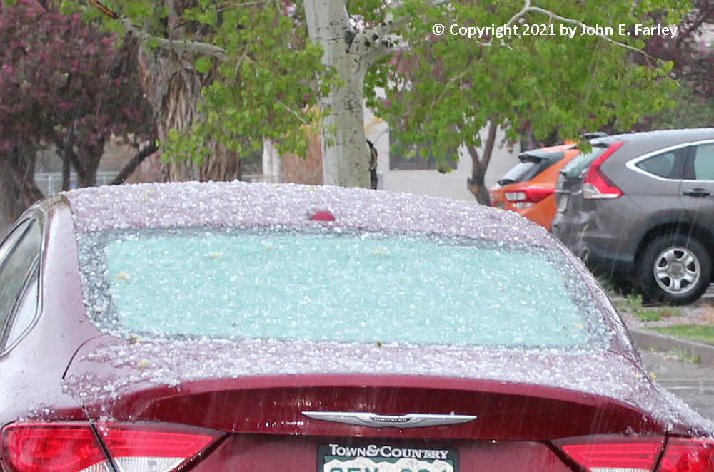 After getting these pictures, I continued on into Alamosa, figuring I would arrive about the time the storm did and could find a safe spot to stop in town, away from traffic, to get video of what looked like the near certainty of winter precipitation with thunder and lightning. As I got to the edge of town, a mix of rain and graupel and/or ordinary snow began to fall. I began to record the storm through the windshield. I drove a ways to find a good place to stop and roll down the window to get better video, and by the time I did, rain, snow, graupel were coming down, with lightning and thunder. The first place I stopped, though off the highway, still had a lot of traffic, bringing unwanted background noise to my video. So I paused the video and moved to a quieter place in a residential neighborhood. The storm continued to produce its wintry mix this entire time, with the temperature on my car thermometer plunging from the low 60s just before the storm down into the 40s. Shortly after I resumed the video, some hail began to mix in, and for a short time 1/4 to 1/3 inch hail became the predominant precipitation type, though still with some rain, snow, and graupel mixed in. Then the hail stopped and it went back to rain, snow, and graupel (snow pellets). The storm lasted for more than 20 minutes with lots of lightning and thunder throughout the storm, covering the ground and parked vehicles with snow and hail, despite the rain that was mixed in. This was one of the most unusual storms I have ever seen - rain, snow, graupel, and hail all at once, with thunder and lightning. Also some pretty good wind from the southwest at the start of the storm, despite the strong northeasterly wind that had still been blowing at my last stop before I got in town. Here is some video of this most unusual storm: