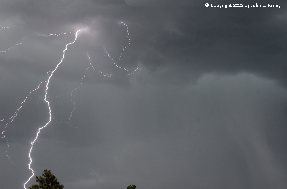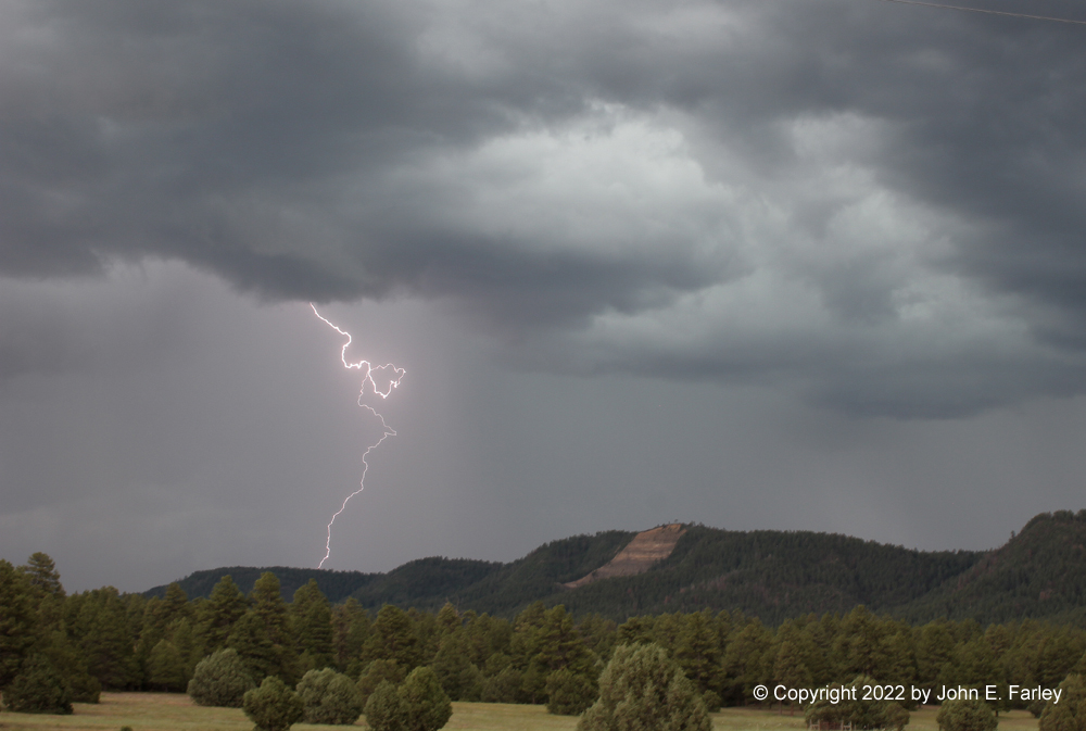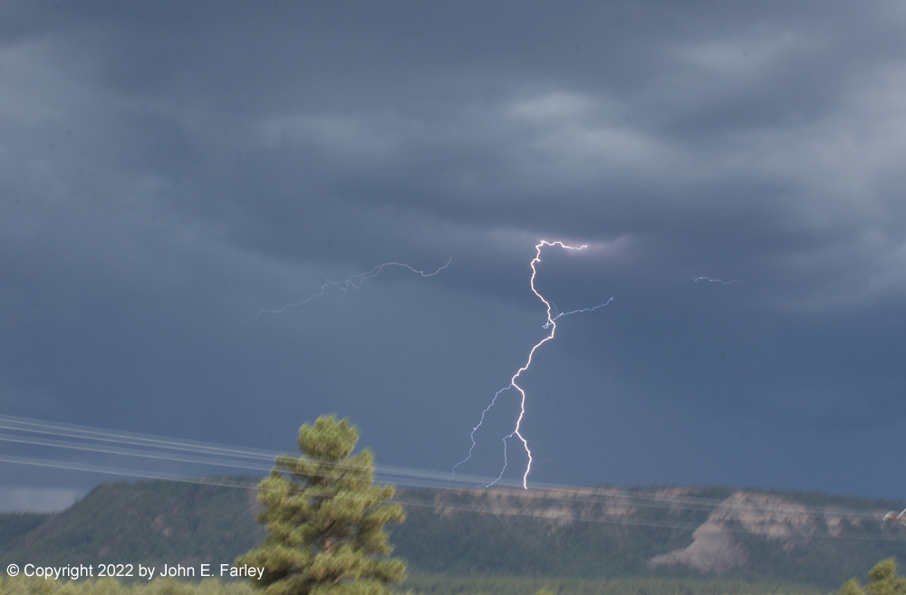 I decided to head south on S. Pagosa Blvd. past the hospital and jog over to Trujillo Road (CR 500) from where the pavement ends on S. Pagosa Blvd, to continue south on Trujillo Rd. I figured this would bring me close to or just west of the track of the storm. As I passed the hospital, I saw a distant bolt of cloud-to-ground (CG) lightning, which gave me hope. I continued south on Trujillo Road to a mile or two north of the Acrhculeta County landfill, watching the storms as they moved over the Archuleta and Montezuma Mesas and Bridge Timber Mountain, to my south and southeast. I set up my camera with the lightning trigger, and over the course of my watching the storms, it triggered more than 100 times. Many times the timing was off or the lightning was out of the frame, but I got somewhere in the range of 25 shots with some lighting in them, including several I am very happy with. By far my best lightning photography outing this year, and one of my better ones ever. Here are a few pictures of the lightning: