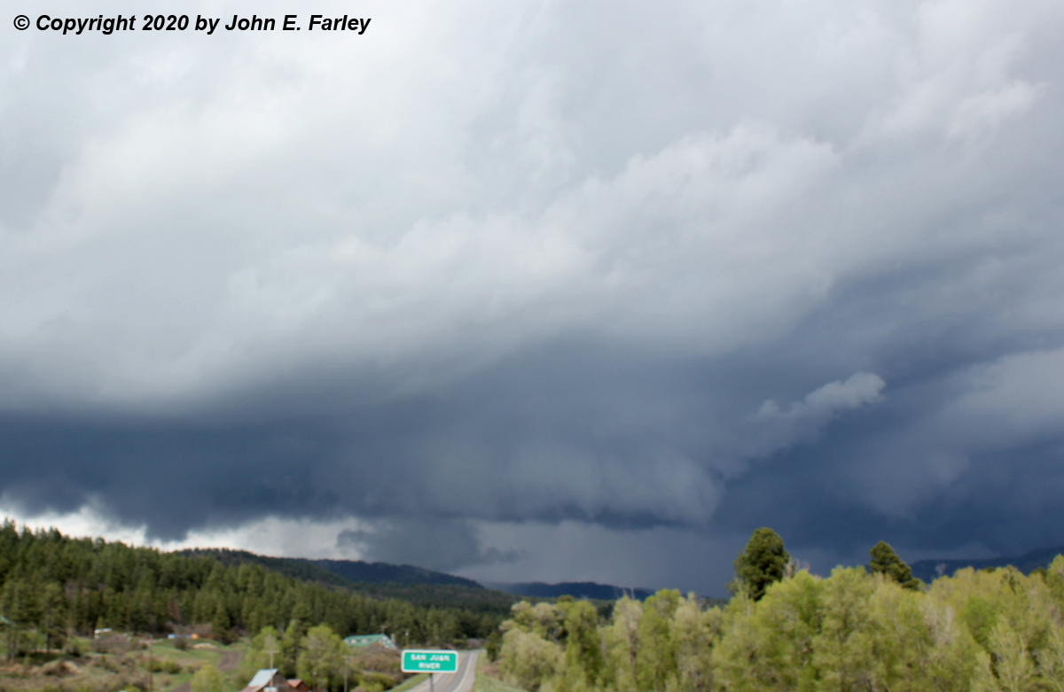 As I got through Pagosa Springs and closer to the storm heading northeast on U.S. 160, I could see storm structure that suggested a pretty strong storm. Once you're out of town, cell service disappears quickly, so you have to rely on your eyes with no help from radar or the lightning tracker. But it was clear that this was a pretty strong storm, and not far out of town, around 3:40, I could see this lowered area which appeared to something of a shelf cloud/wall cloud hybrid: