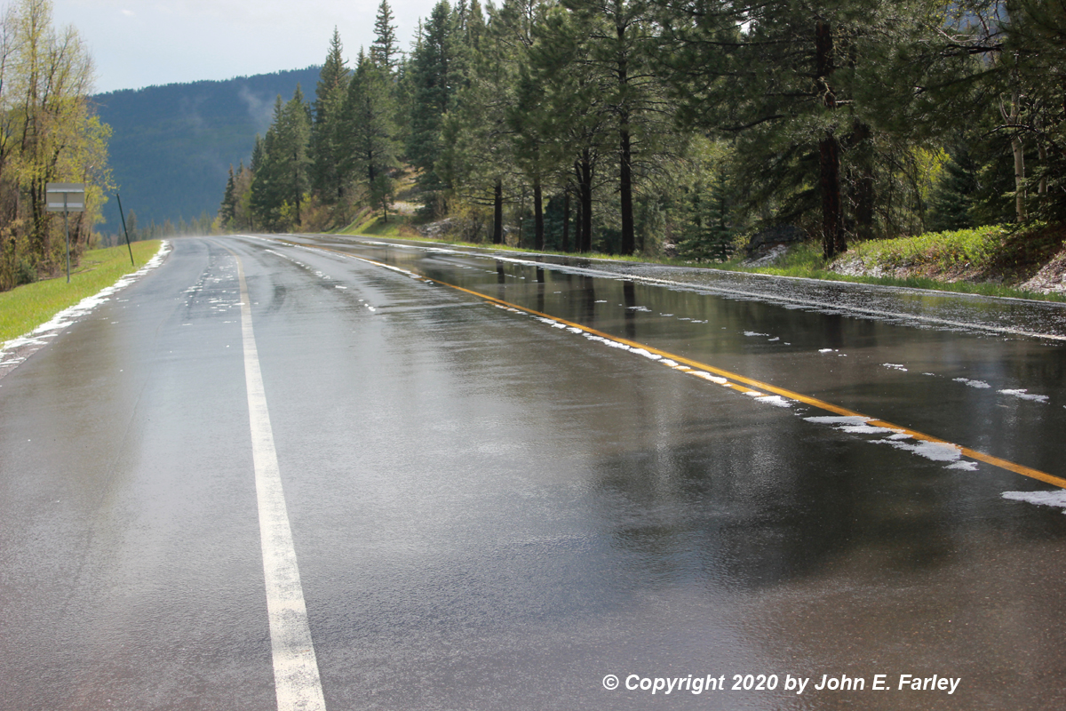 In the picture, you can also see hail fog near the ground on the left and clouds rising up the side of the mountain that probably originated as hail fog. I was at the southwest edge of the storm, and could hear the hail roar as the hail hit the trees on the mountain and between me and the mountain. I had thought that the core of the next cell in the line would move over me, but it continued on the same path as the earlier storms, producing the heaviest hail just to my north near the county line of Archuleta and Mineral Counties, and never fully moving over my location. When the heaviest of the hail passed, I decided to get back on 160 and drive a mile or so to the path where the heaviest hail occured. As I did, a mixture of rain, hail, and graupel or wet snow fell, the temperature having fallen from near 60 before the storms to the upper 30s now. The hail had accumulated to about an inch on 160, the road was very slippery, and many vehicles had stopped to wait out the storm. I managed to safely drive through the hail swath, getting some video as I went. The swath of hail was a mile or so wide, and ended quite abruptly on the other (northeast) side. I turned around and drove through the swath again, now encountering some slightly larger (around .3") hail falling as a tail-end cell moved over, along the same path as the others. I stopped, waited out the hail, and got a couple pictures of the hail, which by now had accumulated to a depth of about an inch on the highway: