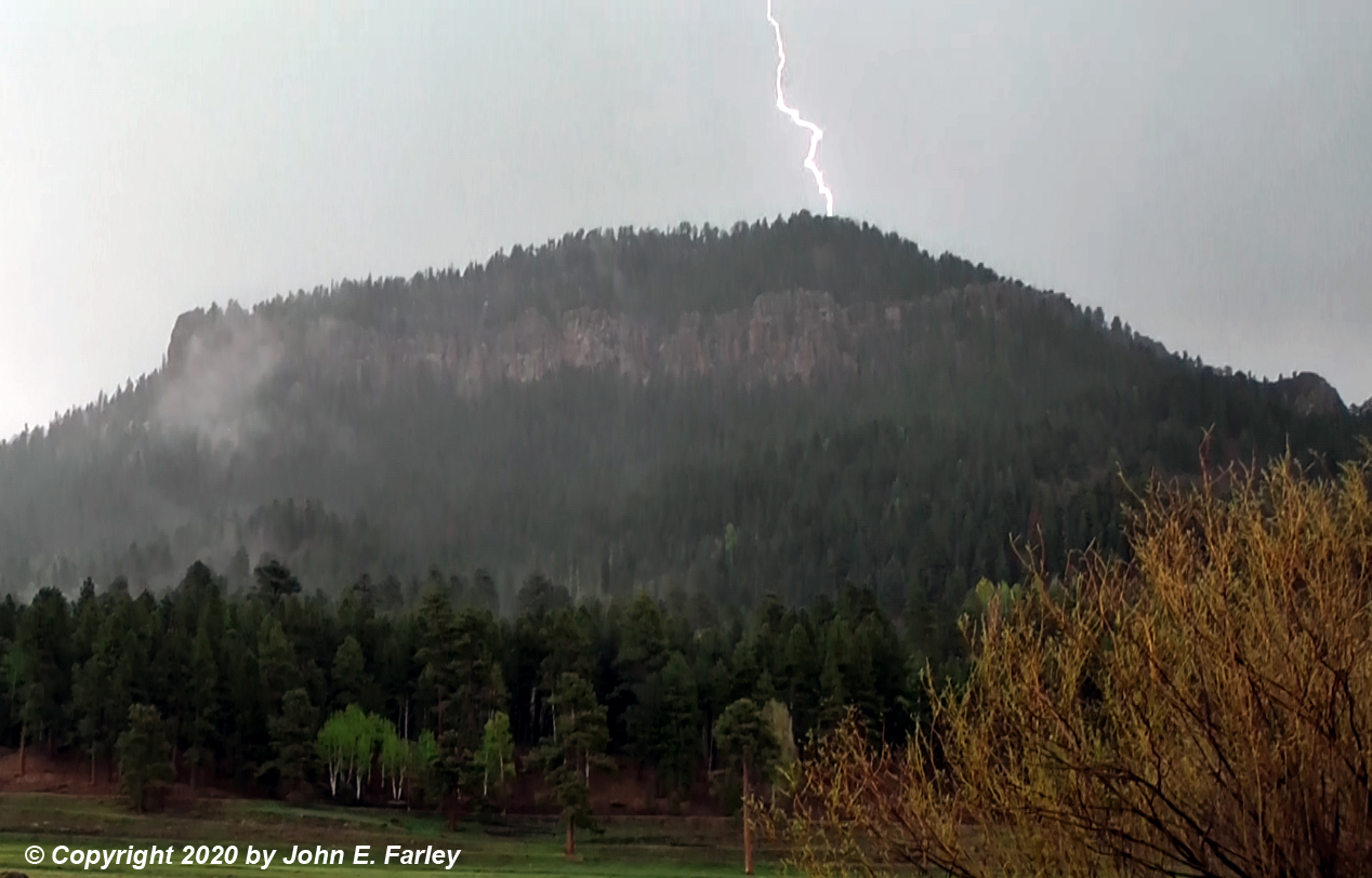 By now, the storm had moved off to the ESE into the mountains, where it undoubtedly produced thundersnow, probably along with hail in places. I headed back toward town, since at the time it did not appear that another storm in this area was imminent. When I got back to the east edge of Pagosa Springs, I could see a fairly strong storm to my southeast, and since radar showed it was over U.S. 84, I probably could have gotten to it. But it looked like it was at its peak strength and perhaps about to weaken, and was moving away from me. At the same time, I could see a line of TCU extending to the WNW from the storm I had been on, along the southwest slopes of the San Juans. I watched a while, saw that some of these were developing into storms, and ultimately decided to head back where I had been. By the time I was about halfway there, I could see that several storms had developed in the line, and were tracking through the same general area as the storm I had been on earlier. Basically, the storms were training through the same area, resulting in repeated storms occurring in the same places. I was on the edge of the storms by the time I reached the turnoff for the East Fork Campgroud, next to the East Fork of the San Juan River. This was around 4:45, and it was evident that hail was falling heavily just to the north and northeast of my location. I stopped there, and soon hail was falling and lightning was zapping down. One bolt appeared to strike the top of a mountain a mile or so away: