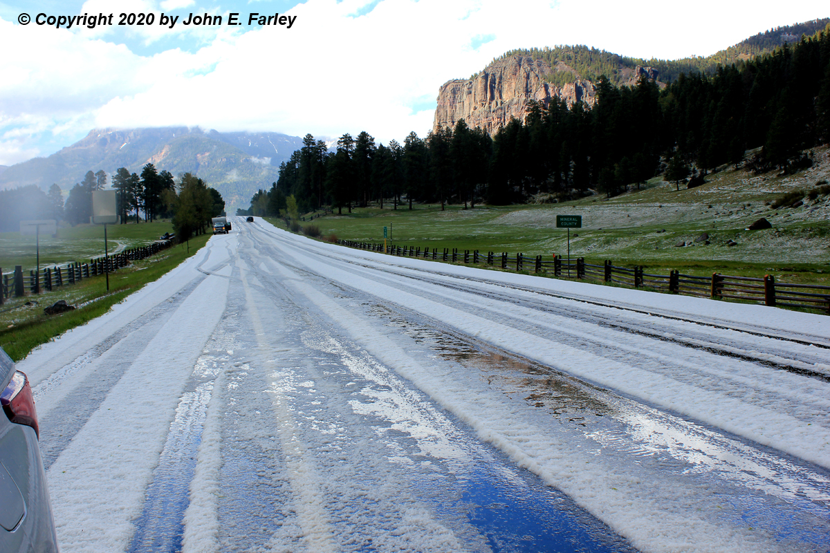 The storm crossed the road a few miles ahead of me, and I continued to the path, where I found hail on the ground, and some on the road, intermittently for about 3 miles beginning just before the Archuleta-Mineral County line, up toward Treasure Falls. I got out and inspected the hailstones, which were hard, true hail, not graupel, and mainly pea-sized. I got pictures of the hail on the ground and on the road.