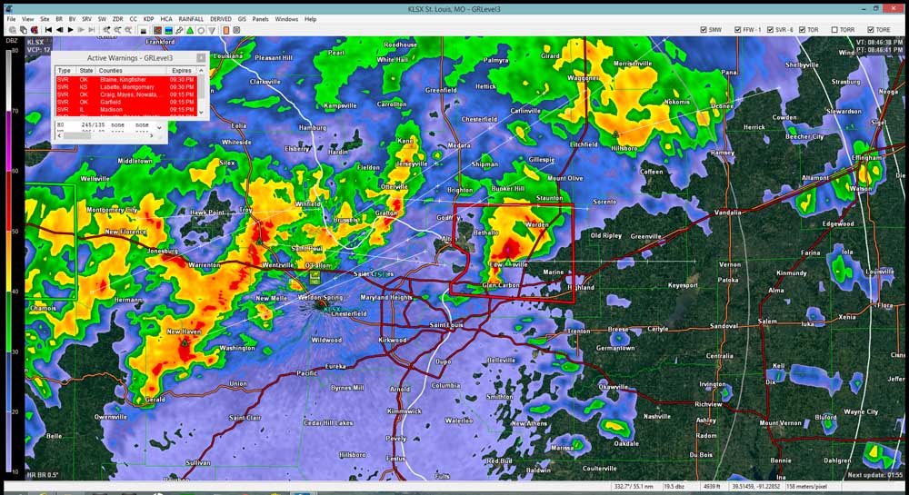 You will also note yet another line of storms coming in behind the supercell. The southern end of this line eventually also took on a supercell structure. Unlike the storms farther north, the southern end of this storm, where the supercell structure developed, was right on the old outflow boundary and thus, this storm was able to become surface-based. The result was that the storm produced a high-end EF-1 tornado which was on the ground for about 6 miles in the House Springs area in Jefferson County, MO. This southern storm received two tornado warnings, the first of which was issued about the time the tornado began, but five to seven minutes before it caused damage to structures in House Springs.