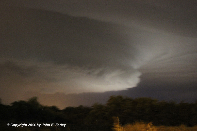 As the updraft area of this now well-developed supercell storm moved closer, basically moving eastward along or just north of I-270 just to the north of my location, a spectacular "mothership" mesocyclone came into view. Lit up by the lights from the business district along route 159 in Edwardsville and Glen Carbon, it offered a view rarely seen in Illinois, especially at night: