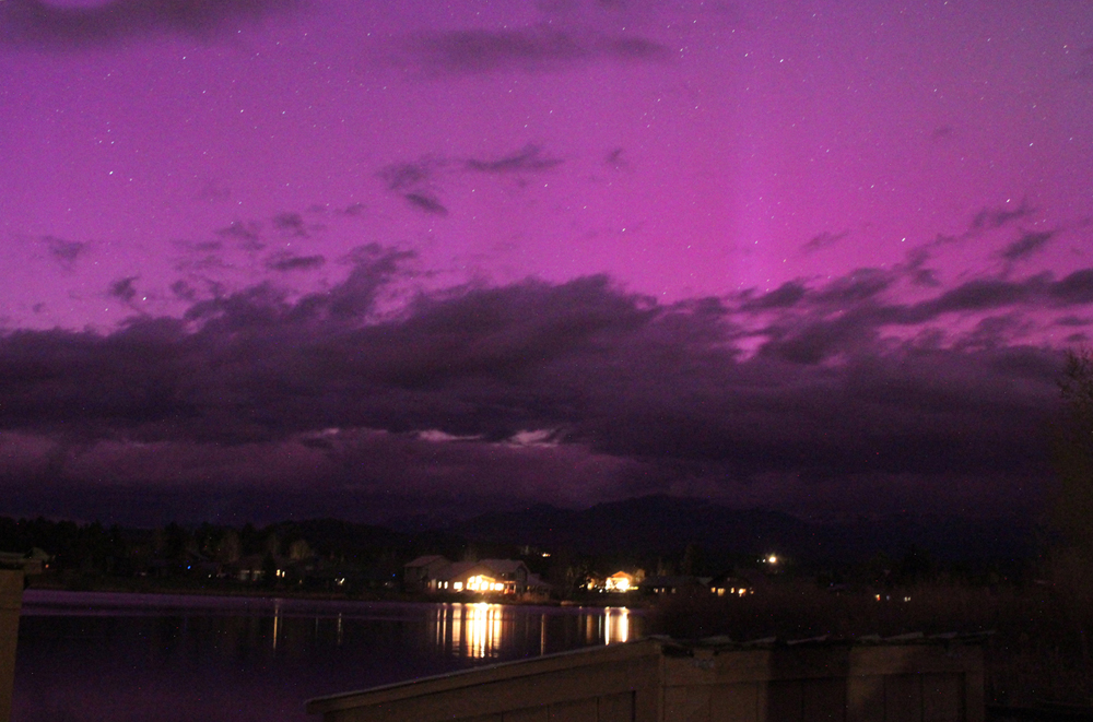 This is something that was evident in many pictures of the aurora that I later saw online, particularly ones taken at lower latitudes. I am sure this would have been much more evident with fully clear skies, but I had to work with the skies I had. All in all, I was pretty happy with my aurora photography efforts. In both of these pictures, but particularly the second one, note the reflection of the pink/purple colors of the aurora on the water near the far side of the lake, where there was a slight ripple on the water. I went back out and tried again around 11:30, but by then, clouds were completely hiding the northern sky, so I called an end to a long but very exciting day. And try to get some sleep ahead of the next day, which also turned out to be pretty exciting.