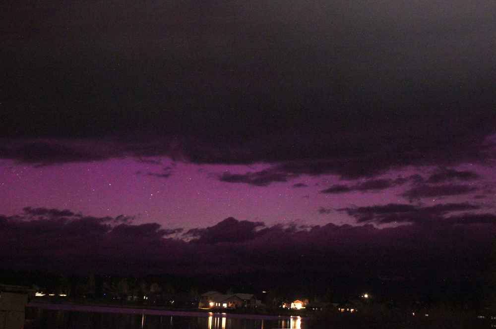 The clouds continued to move northeast, as had been the case all day, and the opening through which I took the picture above narrowed and shifted closer to the northern horizon. That allowed a somewhat different view of the aurora, capturing the pink/purple higher in the sky with a more greenish color closer to the horizon: