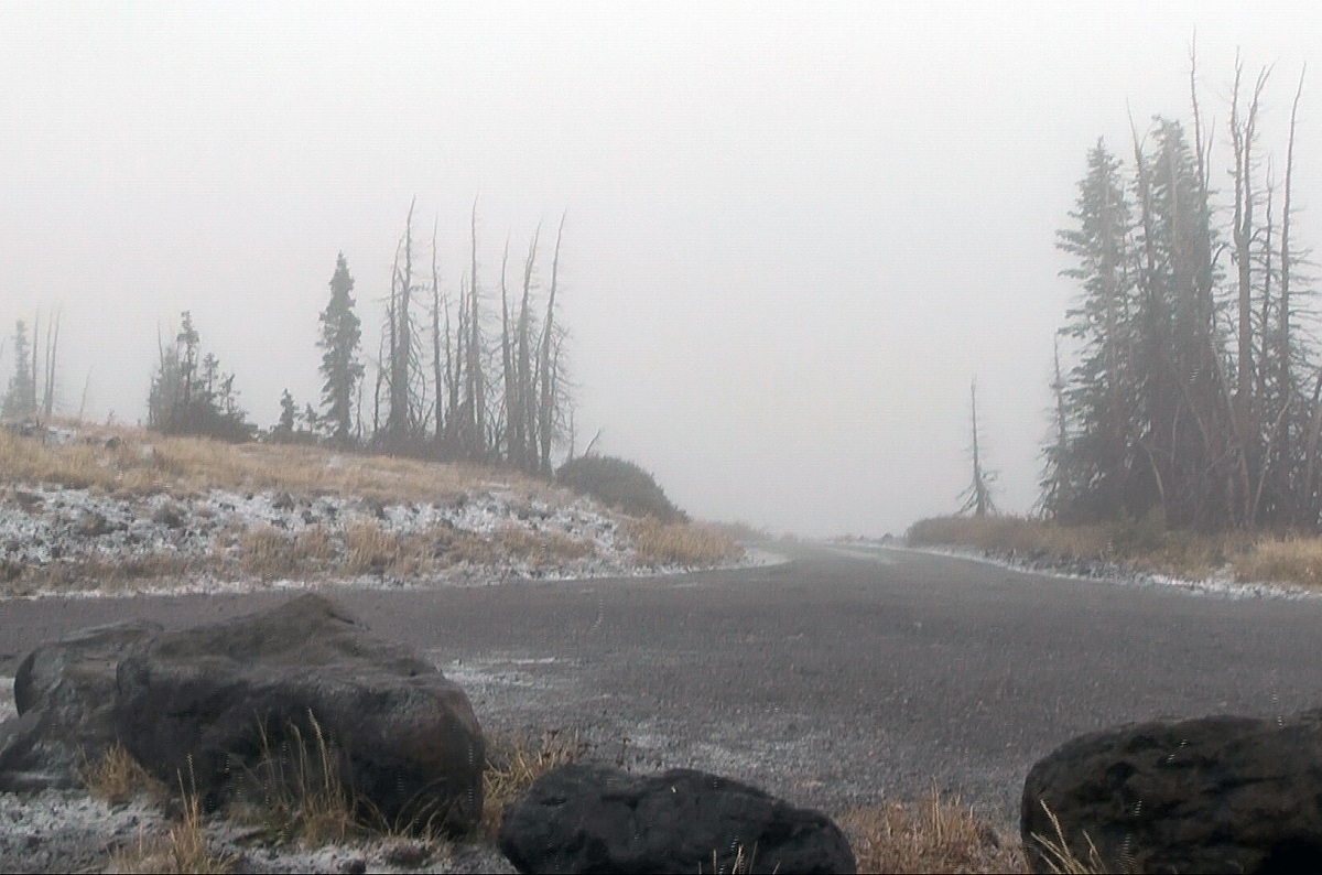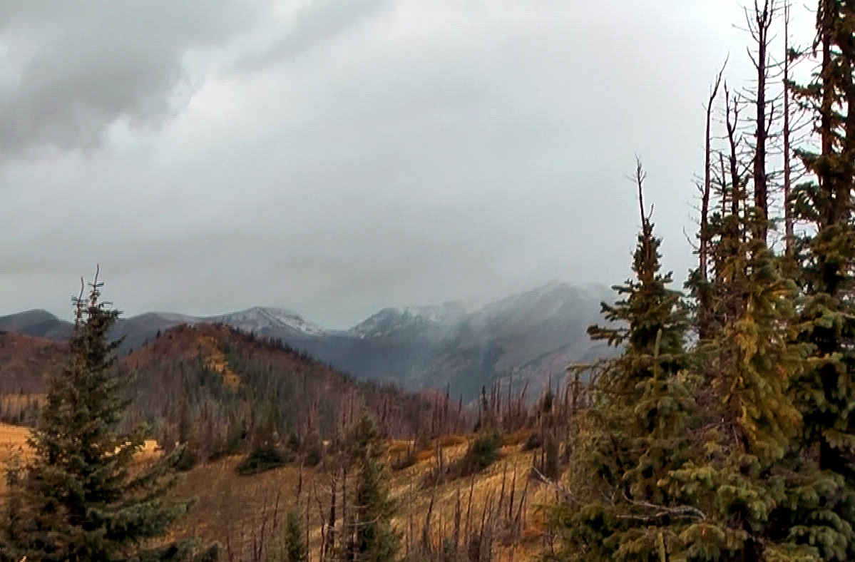 This area would like pass right over my location, or at least very close to it. Soon, precipitation began to also fall from the updraft base ahead of the gust front feature, and I knew the heavier precipitation was very close. Still no thunder up to this point, though. I decided to slightly reposition my car in the parking lot so that the wind and snow would be blowing away from the driver-side window that I was looking out of and getting video from. Soon the graupel (snow pellets) that had been falling intermittently since I arrived at the overlook became steadier and heavier, and the wind increased. Then, gradually, the graupel transitioned to mostly ordinary snow. There was some back and forth in the mix of ordinary snow and graupel from then on, but most of it was ordinary snow. Perhaps 4 or 5 minutes after the heavier precipitation began, I started to hear distant rumbles of thunder. So low, at first, that the video camera did not even pick up the sound of it. But after a few more minutes it became louder and much more frequent. I ended up getting about 5 minutes of frequent thunder with the snow and an occasional mix of graupel with it. Lightning was close enough to be visible 3 or 4 times, and there were two very close and very visible flashes, followed by a crack of thunder within a second. So these two flashes were within a quarter mile of me. This made me a little nervous to have the window rolled down, and I did back away from it a bit, but was fine. And then the thunder and lightning ended almost as quickly as they started, with only one more rumble of thunder after the second close lightning and thunder. But the snow kept coming down, and the wind increased. But no more thunder, so arould 2:30 I started the trip back down. I think that the period of thundersnow was mainly between about 2:10 and 2:20. By the time I left, there was some accumulation of the snow, perhaps up to a third of an inch in some of the grassy areas although very little on the road due to the warm ground. As I headed down, I was surprised that before I even got down to Wolf Creek Pass, rain began to mix in, and by the time I was back down to the pass, it was more rain than snow. Although I suspect there was more snow at the pass level at the height of the storm, I was glad that I had gone up to the Lobo Overlook where there was no rain mixed in at all. Continuing down from the pass, I did encounter a couple heavier bursts of precipitation with a little more snow mixed in, so I would imagine the snow at the overlook continued for a while after I left. And by the time I got back to Pagosa, a third band of thundershowers was moving through, and this band produced more snow in the mountains. By the next morning, the mountains visible from town had a nice coating of snow at the upper altitudes, and there was enough snow a little farther north in the Weminuche Wilderness that the mountains still remained snow covered 3 days after the storm passed.