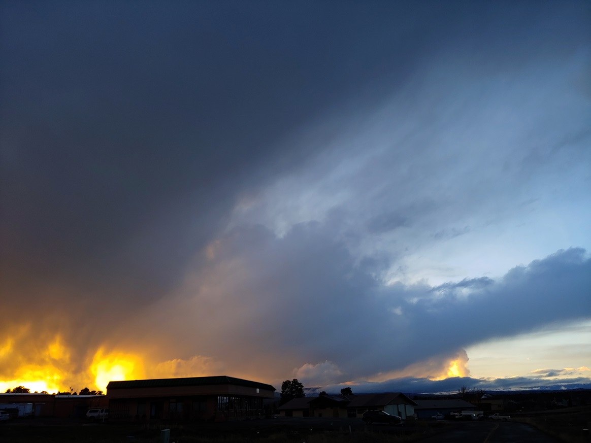 Later that evening around sunset, as my wife and I were returning home from a restaurant, the setting sun beautifully illuminated a cluster of snow showers west of town: