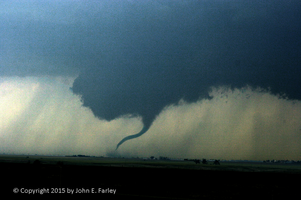This sunlit but very rain-wrapped tornado formed under the second of two supercells that moved through the Arlington, CO area, and just northeast of La Junta. The tornado was nearly stationary but only lasted a few minutes, remaining in open country south of Arlington.