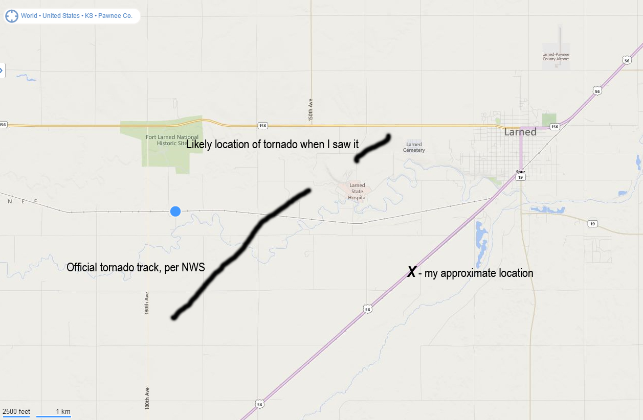 As far as I know, the NWS did not ever do a damage survey in this area, and apparently based the track reported in the Storm Events Database (approximate track mapped above) on reports they received from a chaser who were on the tornado near Frizell. At the time of these reports, I was south of the tornado and from my viewpoint the tornado was completely obscured by rain. The tornado was rated EF-1 with a path length of 3.3 miles, with that official path ending about a mile west of the State Hospital, or about a mile or two short of the location where it likely was when I and the okweatherwatch group saw it. I only saw the lowering associated with the tornado when it emerged from the rain as I was driving toward Larned, a couple miles southwest of town. I immediately stopped and videoed the lowering as the Larned sirens blared, looking roughly to my northwest or NNW with the lowering moving, as I watched it, to a position to my N or NNW. It certainly looked like a tornado to me, but I was unsure at the time due to low contrast and wrapping rain.