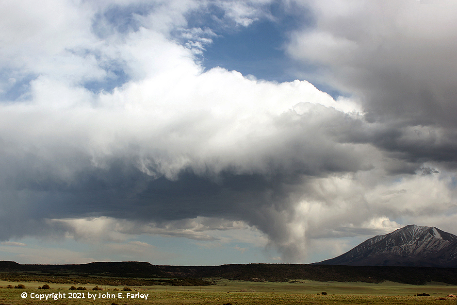 This is NOT a tornado, or even a funnel cloud, but it is one of the more interesting look-alikes I have seen. It actually is precipitation coming out of the cloud, likely in the form of snow and/or graupel (snow pellets) at the cloud base. However, the air at the surface was very dry, making most of this precipitation what is known as virga, i.e. precipitation that is evaporating before reaching the ground. It is likely that some of it was reaching the ground as light rain, as ground temperatures were quite warm, unless it fell somewhere near the top of a mountain, in which case it could have remained snow. But most of it was likely evaporating before reaching the ground. To an untrained or inexperienced eye this probably looks like a tornado, but the absence of rotation, the texture of it, and its large area relative to the parent cloud all clearly indicate that it was not - just an interesting appearance to precipitation coming out of the bottom of the cloud.