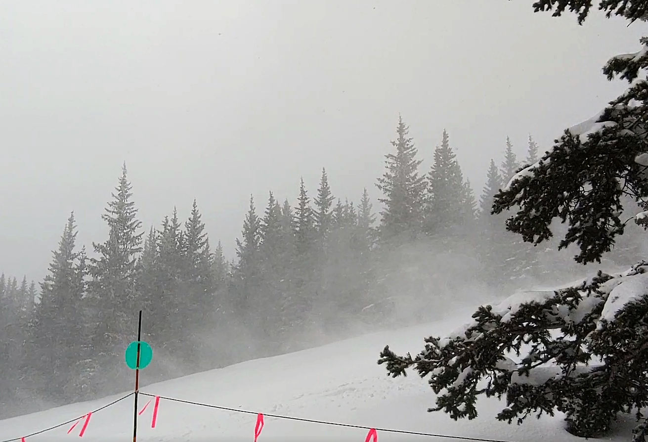 This wind-driven snow squall, which arrived a couple hours later, was accompanied by several runbles of thunder. The same storm produced hail in a number of locations, with 1-inch hail falling near Glorieta (to the southeast of the ski area) at the same time that thundersnow was ocurring at Ski Santa Fe.