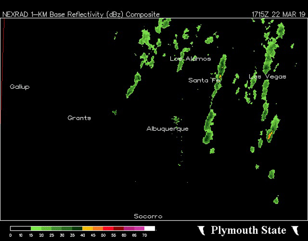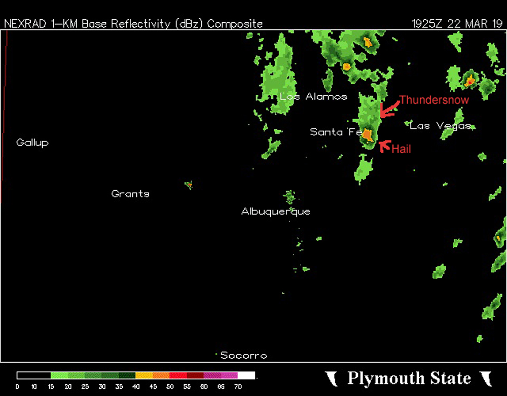 Note the areas of yellow on the radar image above the e of Santa Fe. This is where the heavy graupel was resulting in radar returns in the 40-45 dbz range, pretty high for winter-type precipitation. You can also see the negative tilt of the overall storm system, as you could draw a line from northwest to southeast across this radar image with all of the showers, squalls, and storms to the northeast of that line. This imaginary line could be extended southeastward into the Texas Panhandle, with the storms that produced severe weather around and west and north of Amarillo being on the same side of that imaginary line as this activity in New Mexico. Note also that the band of squalls that hit the ski area is quite narrow, which is why the heavy precipitation only lasted for about 20 minutes at the ski area. Then, the sun came out.
