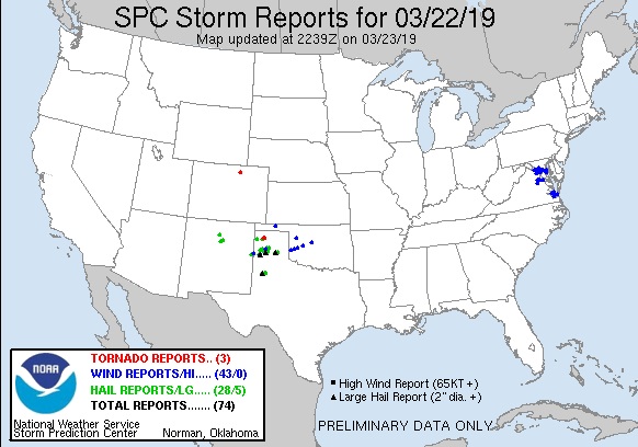 Here is the storm report map from SPC for the day.