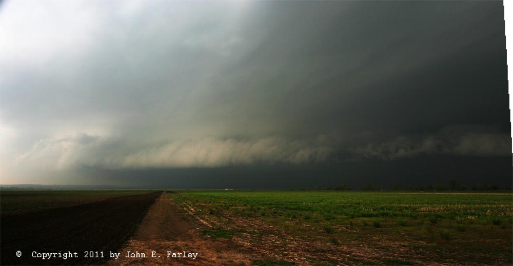 The mesocyclone of the now rather HP-ish looking storm was quite impressive as it approached the flat flood plain of the Illinois River. It had a very pronounced inflow band from the northeast into the meso, with rapid cloud movement in that inflow band. Here is what the storm looked like when I intercepted it: